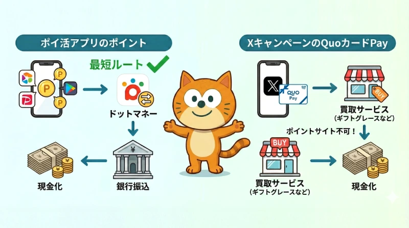 結論はシンプルです。ポイ活アプリで貯めたポイントは、ドットマネー経由で銀行振込。 Xキャンペーンで当たったクオカードPay(Quoカードペイ)は、買取サービスで現金化するのがベターです。